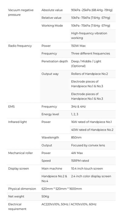 • Tecnología: EMS + RF Bipolar + Infrarrojo Focalizado + Masaje con Vacío + Masaje con Rodillo Mecánico
